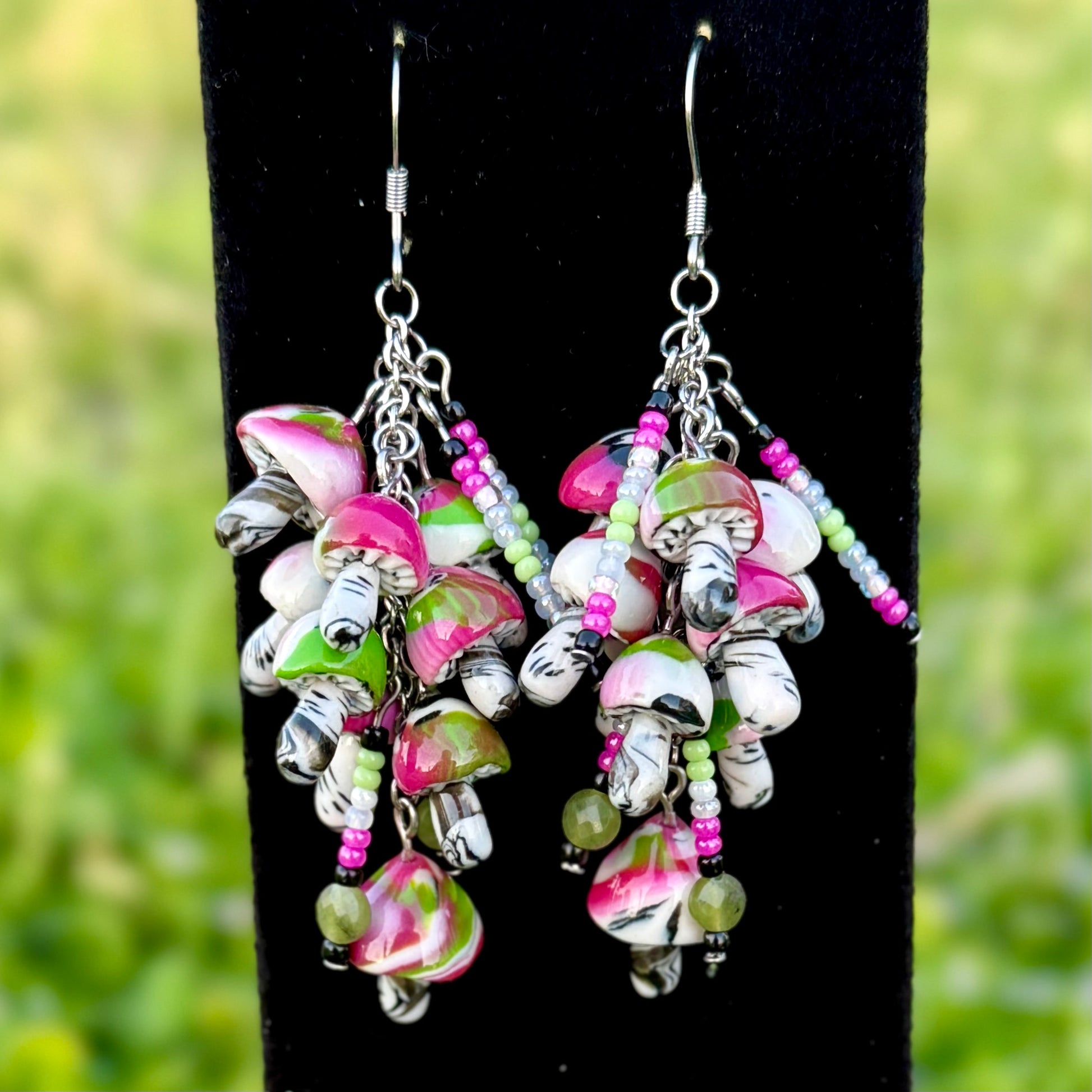 Charming dragonfruit-inspired polymer clay mushroom clusters, fit together to form a delightful chandelier earring duo, playfully adorned with strings of vibrant micro beads in shades of white, pink, and lime green.